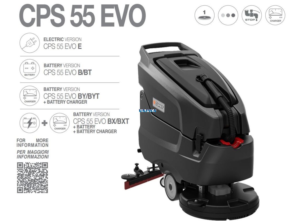 COMET CPS 55 EVO BXT - Větší podlahový baterový (B) mycí stroj kompletní (X - baterií a nabíječkou) s pohonem pojezdu VPŘED a VZAD (varianta T). Zejména vhodný pro mycí, čistící a udržovací práce a čištění podlahových ploch. Velmi kompaktní drhnoucí stroje vhodné pro údržbu. Uklid tvrdých podlahových ploch (do 1500 m2) . Obzvláště vhodné pro čištění autosalonů, servisů, dílen, prodejen, posiloven a wellness center apod.