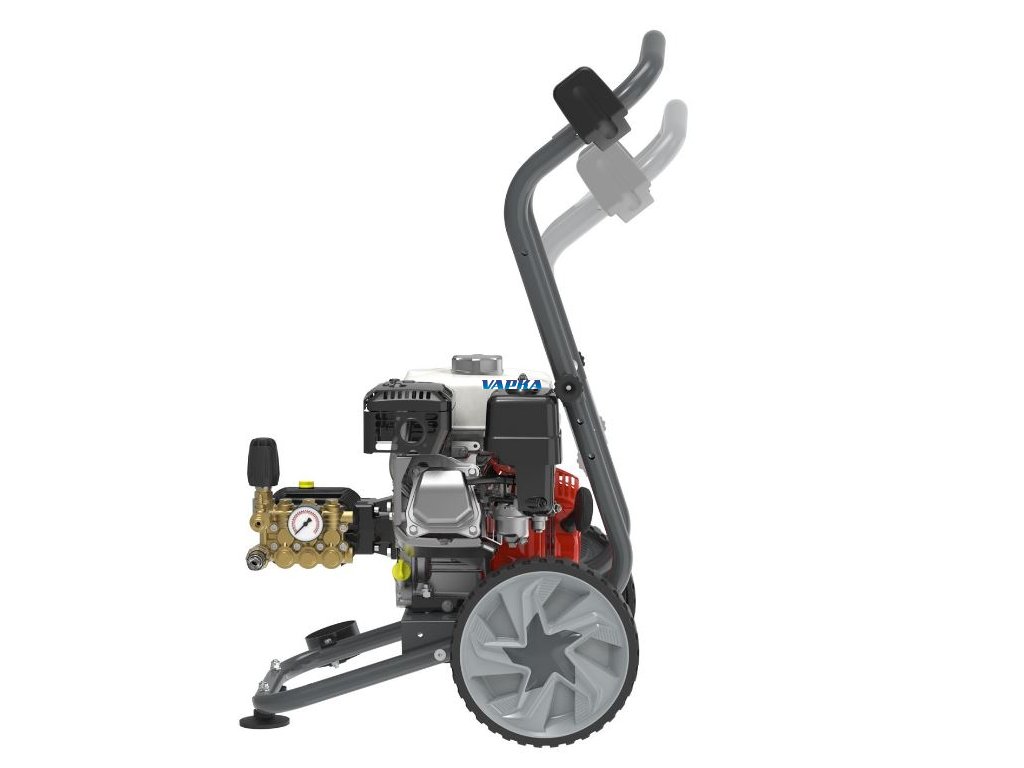 Vysokotlaký čistič se vyznačuje robustním kovovým rámem se dvěma koly pro snadný přesun v terénu. Vysokotlaký čistič