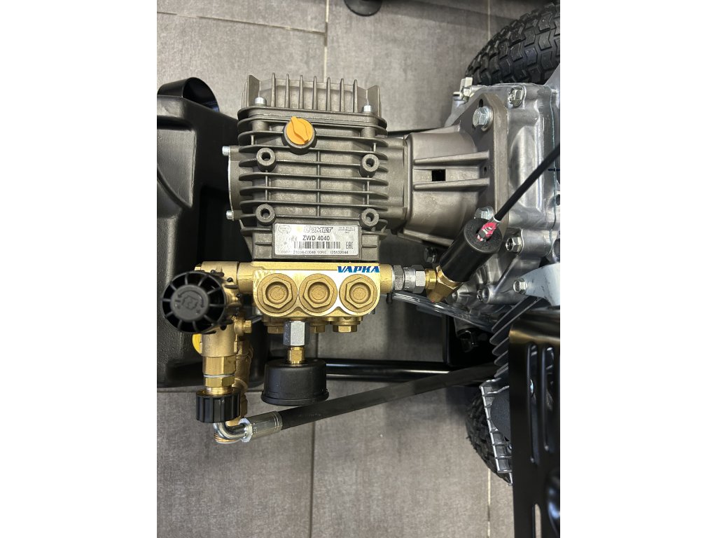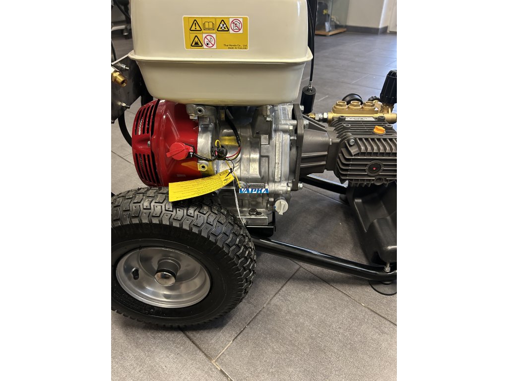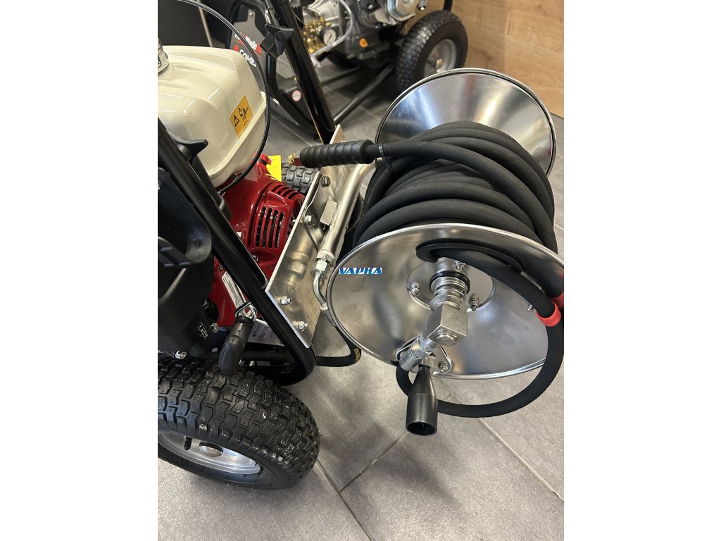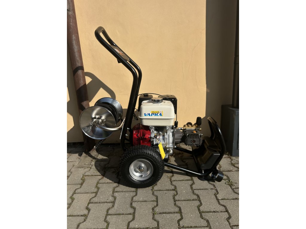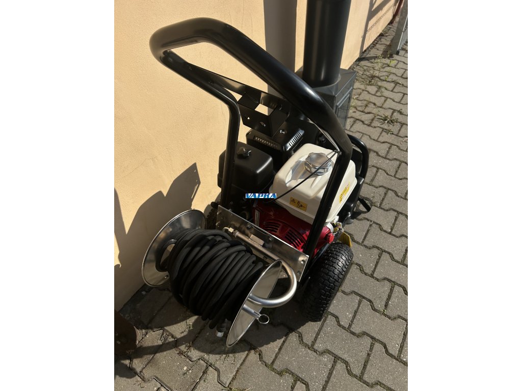 Benzínový motor Honda • Sada zpomalovače otáček • Samonasávací triplexní čerpadlo Comet ZWD, 3 keramické písty, mosazná hlava čerpadla, bronzové tyče se šroubovaným ventilem • Ejektorová sada pro nízkotlaké sání čisticího prostředku (vyjímatelné) • 5litrová nádrž na čisticí prostředek s filtrem a víčkem • Snadno opravitelný sací vodní filtr • Bezpečnostní zařízení proti oleji pro ochranu motoru • Tlakoměr • Velká pneumatická kola Ø 300 s ocelovým ráfkem • Stabilizační gumové nožičky • Kryt čerpadla z nerezové oceli na vyžádání • Termostatický ventil proti přehřátí